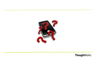 This document provides an overview of mobile app testing challenges and best practices. It discusses the different types of mobile apps (native, mobile web, and hybrid), as well as challenges related to the large number of devices and OS versions, simulating real-life scenarios, usability, and development practices. Automation testing tools are presented, along with the importance of selecting representative devices for testing, simulating real-life scenarios, monitoring device logs, and using automation selectively on devices and simulators. The document concludes by offering ThoughtWorks' mobile app testing services.