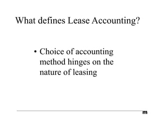 This document provides an overview of lease accounting standards under US GAAP, IAS, and AS 19. It defines key lease classifications such as operating and finance leases. For operating leases, it outlines the accounting treatment for lessees and lessors. For finance leases, it discusses how lessees should recognize assets and liabilities, and how lessors account for the transactions. It also covers sale and leaseback transactions and treatment of residual values under various standards.