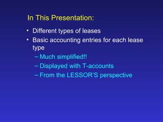 The document explains lease accounting basics, outlining different lease types and their accounting entries using T-accounts from the lessor's perspective. It distinguishes between operating and finance leases, detailing their financial implications and classification criteria according to FASB and IRS standards. Additionally, it covers the impact on general ledger accounts and how leases are recorded compared to loans.