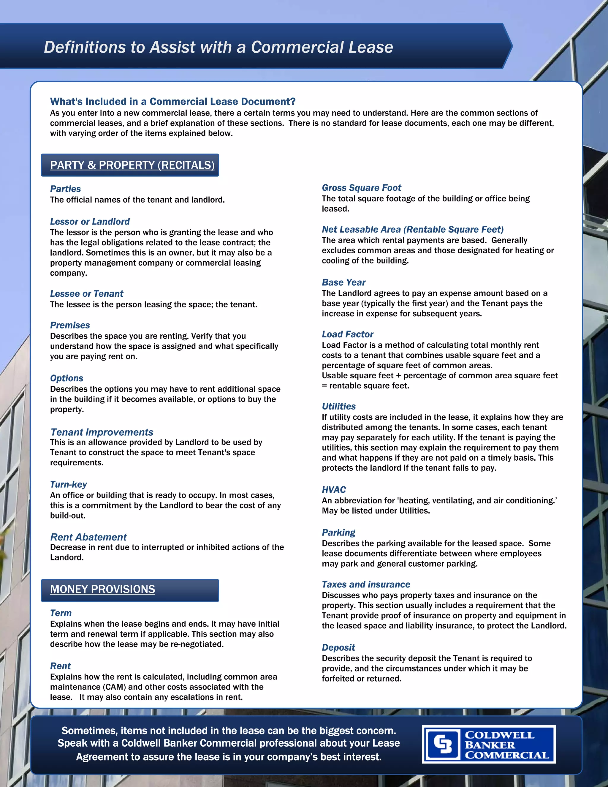 This document defines common terms found in commercial lease agreements. It explains sections typically included such as parties, premises, money provisions, use and restrictions, allocations and risk, relations with third parties, and types of leases. Key terms defined are gross lease, net lease, and triple net lease. The document is intended to assist those entering a commercial lease understand common lease terminology.