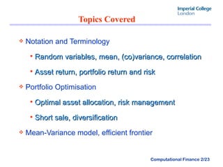 The document provides an overview of key concepts in portfolio optimization and the Markowitz model. It defines terms like random variables, mean, variance, correlation, asset returns, portfolio return, risk, and diversification. It then describes how the Markowitz model uses a mean-variance approach to optimize a portfolio by maximizing expected return for a given level of risk. The efficient frontier shows the minimum risk portfolio for each level of expected return.