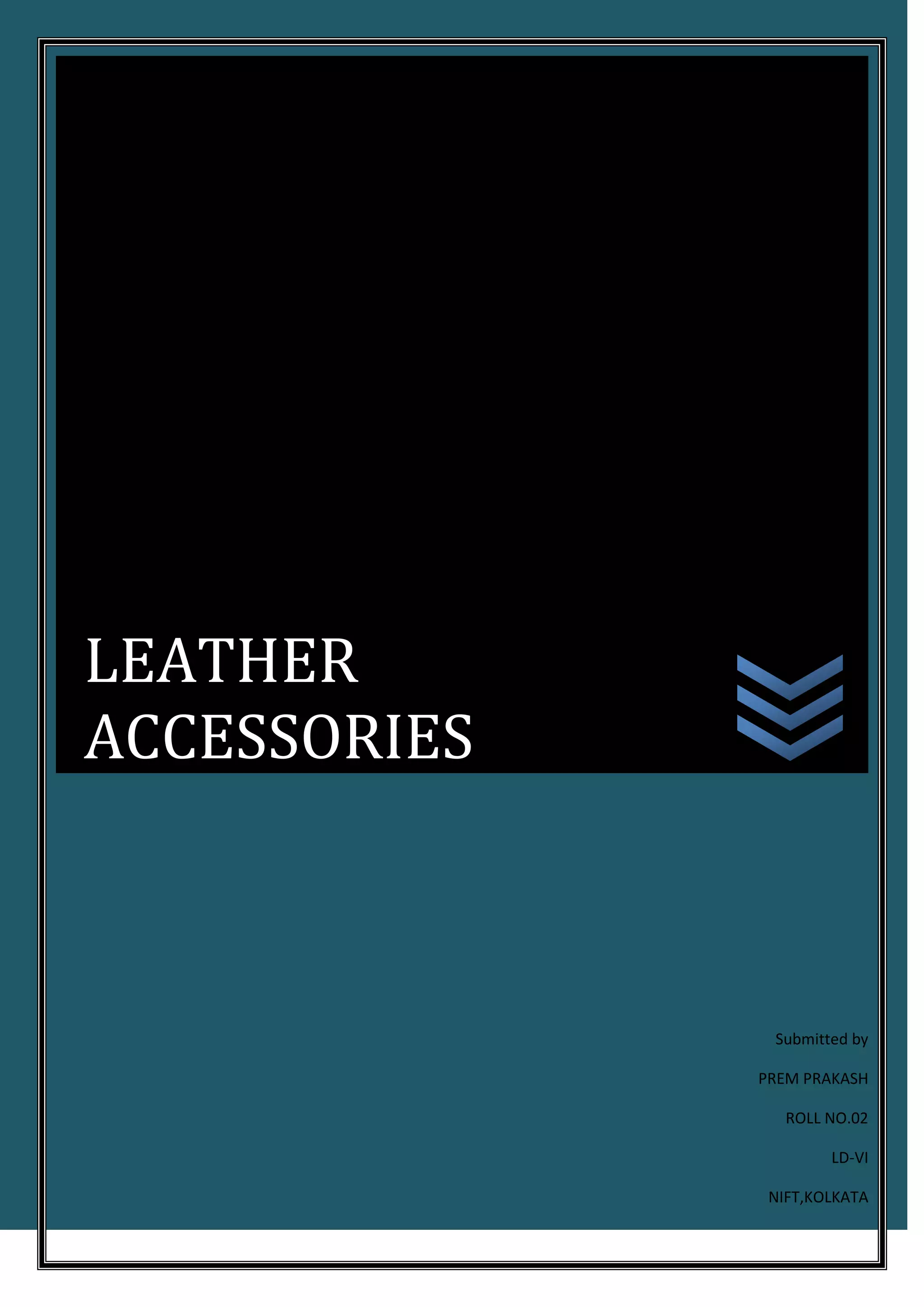 The document describes a leather multimedia organizer submitted by Prem Prakash. It includes a front and back image of the organizer. The materials used are listed as black leather, raxine, wood (MDF), paper board, black nubuck lining, rubber solution, and fevicol. A materials cost sheet provides the costs for each material and the total cost of Rs. 502.5. The concept is described as a leather organizer designed to preserve and protect papers, CDs/DVDs, pens, and paper in a suitable design that is ideal for gifting and can be used horizontally or vertically in offices or corporate settings.