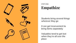 The document outlines a 10-step process for designing and making a leather bag called "Ami". It begins with empathizing with the target audience of students and identifying their need for an organized bag. Through ideating, prototyping, testing, and refining the design, key features of a compact, multifunctional and fashionable bag with many compartments were developed. Materials were purchased and leatherworking and sewing skills were learned to physically construct the bag. Feedback was incorporated and the design process was ongoing.