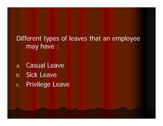 1. Defined benefit plans allow employees to earn various types of leaves including casual, sick, and privilege leaves.
