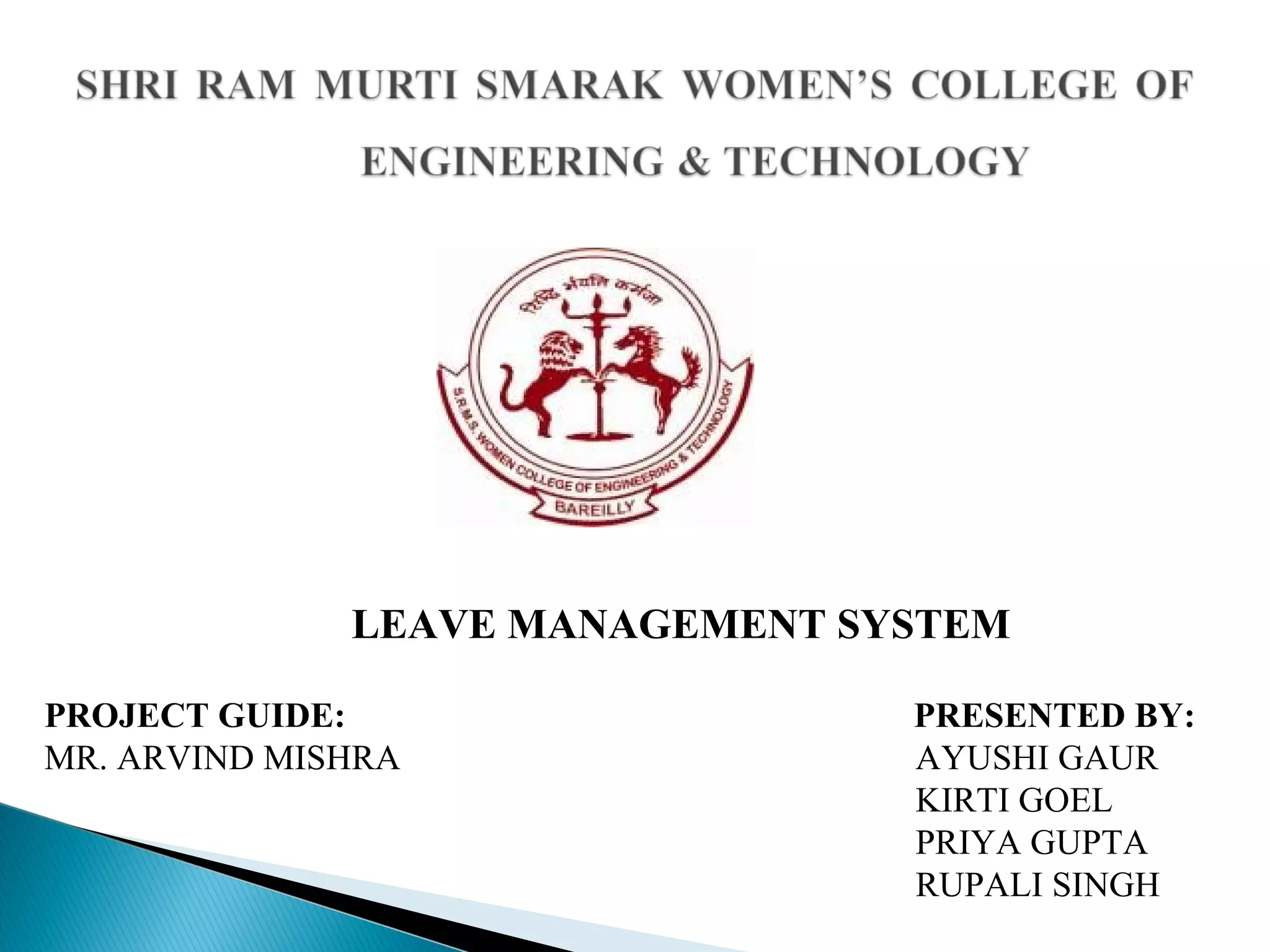 The document describes a proposed leave management system that aims to decrease paperwork and easier record maintenance by maintaining leave records digitally. It discusses the existing manual system and outlines the proposed automated system with modules for administration, students, employees, Head of Department, and Principal. The system would allow online applying, verifying, and approving of leaves while maintaining records that can be viewed by users. Hardware and software requirements are also specified.