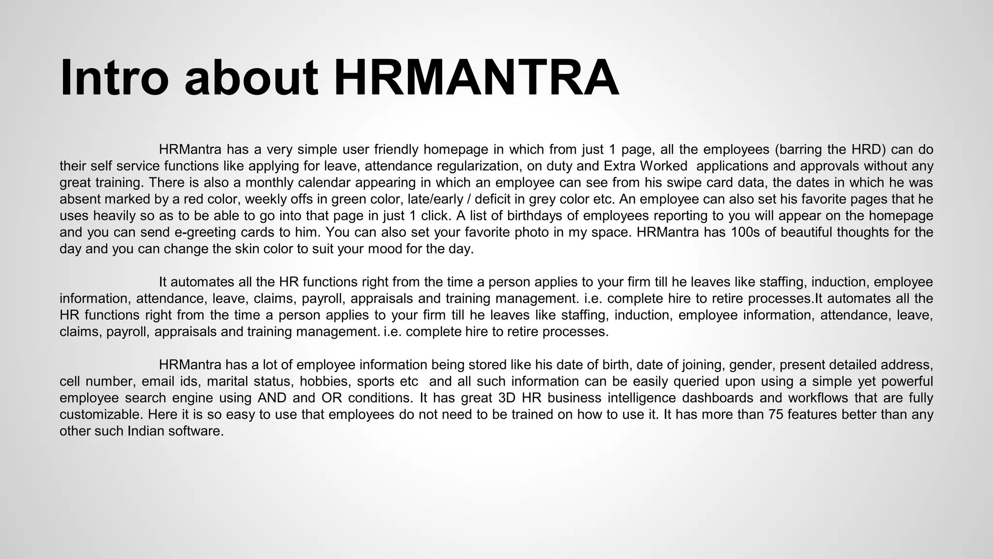 HRMantra is a user-friendly HR automation software that handles all HR functions from hiring to retirement, including leave management, attendance tracking, payroll, and more. It stores extensive employee information and uses a powerful search tool to access data. HRMantra offers global leave rules, customizable forms and reports, and self-service options to simplify processes for both employees and HR managers.