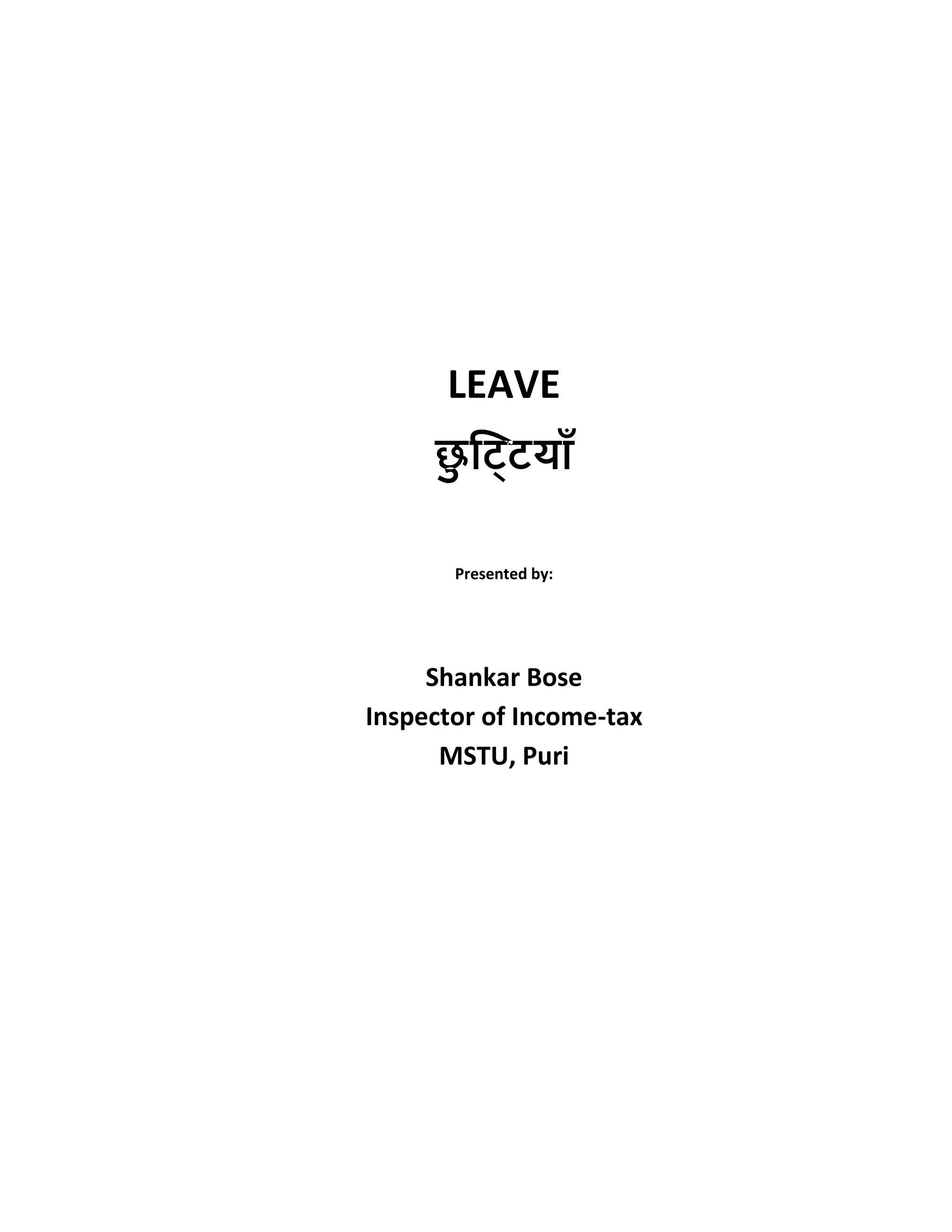 This document summarizes the various types of leave available to government servants (GS) in India. It discusses leaves that are debited to the leave account like earned leave, half-pay leave, and commuted leave as well as leaves not debited like study leave and maternity leave. It provides details on the eligibility and limits for each type of leave. Key points include that earned leave is credited at 15 days every 6 months up to a maximum of 300 days, half-pay leave is credited at 10 days every 6 months, and commuted leave can be taken instead of half-pay leave with a medical certificate. Maternity leave is allowed for up to 180 days and child care leave can be taken for up to two