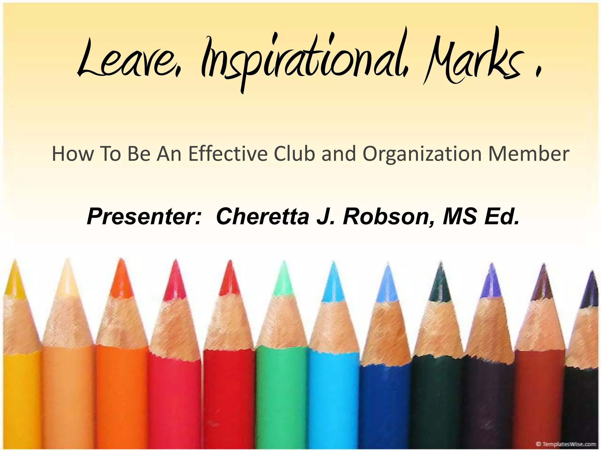 This presentation discusses how to be an effective member of a student club or organization. It emphasizes that organizations rely on new student leaders to replace outgoing members and keep the organization running. The presentation teaches that effective organizations have new ideas, creativity, motivated members, and student leaders. Traits of successful leaders include the ability to inspire, enthusiasm, dedication, maintaining confidentiality, adaptability, goal setting, trust, confidence, identifying goals, and accepting criticism. Members are encouraged to leave their inspirational mark and take leadership to the next level by emphasizing their experiences on resumes and in interviews.