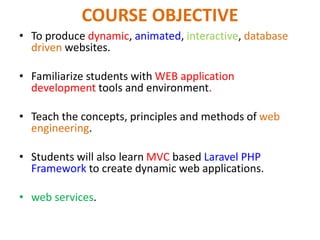 This document provides an overview of a web engineering course. The course objectives are to develop dynamic, database-driven websites using tools like PHP frameworks. Students will learn to create responsive interfaces, web applications with Laravel, and web services. The course consists of lectures, labs, assignments, and exams. Key topics include HTML, CSS, JavaScript, PHP, frameworks, and web development tools.