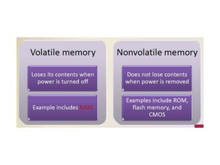 This document provides an introduction to computer hardware, focusing on microprocessors and memory. It discusses the functions, components, and operations of microprocessors, including integrated circuits, cache memory, and different types of RAM and ROM. Additionally, it covers the concepts of micro-controllers and multi-core processors, ongoing advancements in technology, and challenges such as the memory bottleneck.