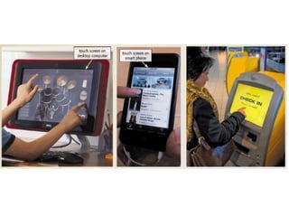 The document discusses various computer hardware components, including input and output devices. It describes common input devices like keyboards, mice, scanners, microphones, and webcams. It also discusses output devices such as monitors, printers, speakers, and projectors. The document provides details on how these devices work and their functions in inputting data and instructions into a computer or outputting the results of processing.