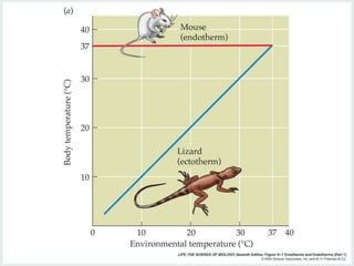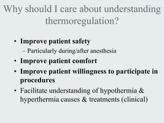 Thermoregulation involves balancing heat production and heat loss to maintain a constant body temperature. Body temperature is affected by ambient temperature, activity level, digestion, and time of day or year. Endotherms internally regulate temperature through mechanisms like shivering, vasoconstriction, and brown fat metabolism. Ectotherms rely on external temperatures and behaviors like changing orientation. Hypothermia occurs when heat loss exceeds production, while hyperthermia is an excessive rise in core temperature. Both require warming or cooling treatments respectively.