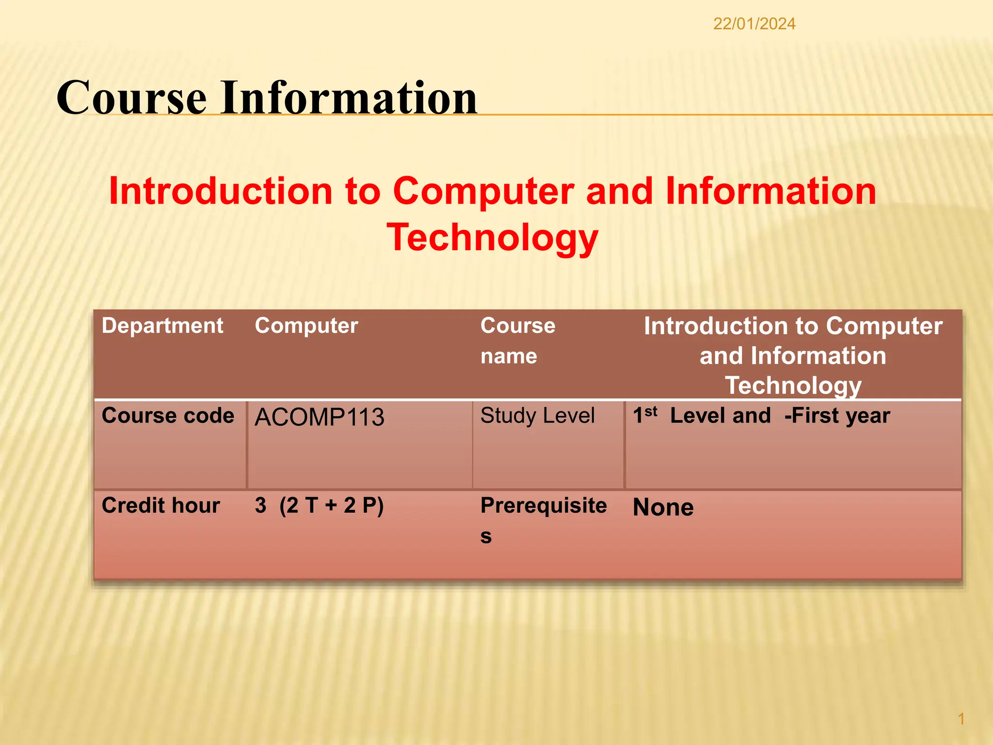 The document outlines a course on Introduction to Computer and Information Technology, covering operating systems, networking, web development, programming languages, and database management. It details the course objectives, including understanding network types and protocols, and the assessment structure with practical assignments, quizzes, a midterm, and a final exam. The course aims to equip students with foundational skills necessary for computer programming and teamwork in projects.