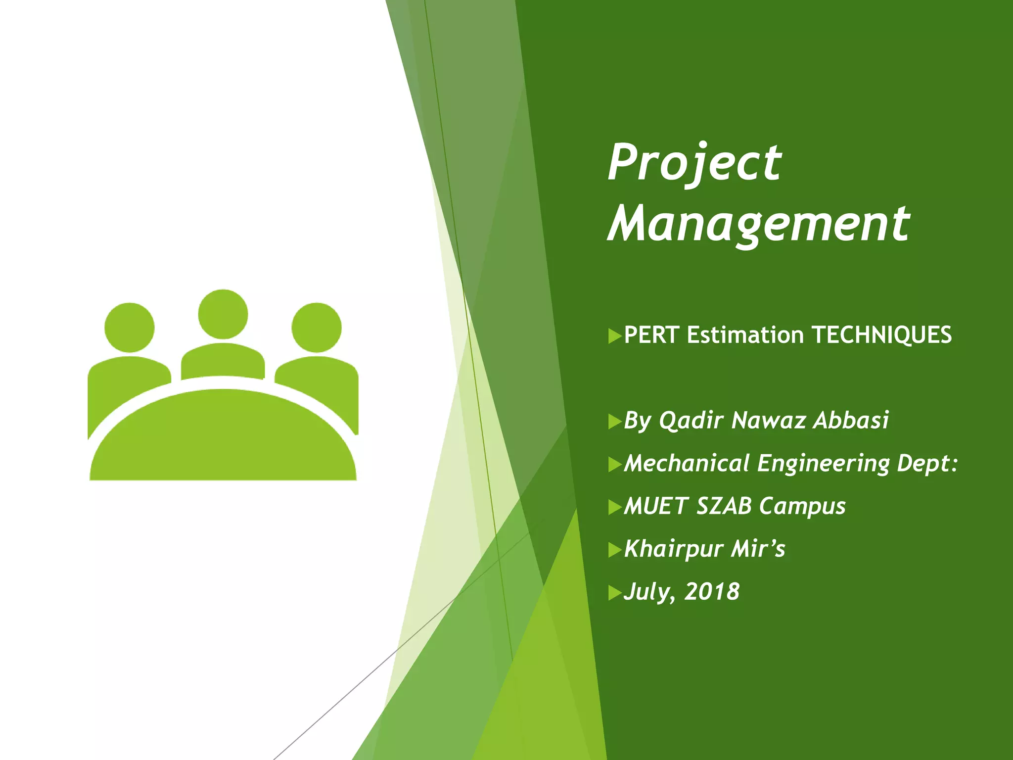 This document discusses PERT (Program Evaluation and Review Technique), which is a successful method for estimating project timelines. PERT breaks projects down into detailed tasks and estimates optimistic, most likely, and pessimistic time estimates for each task. It uses a beta probability distribution to calculate expected task times and project variance. The expected times are combined to estimate overall project completion time, while variances are used to calculate a standard deviation and confidence intervals for finishing the project on schedule. PERT allows estimating project timelines statistically while accounting for uncertainty in task durations.
