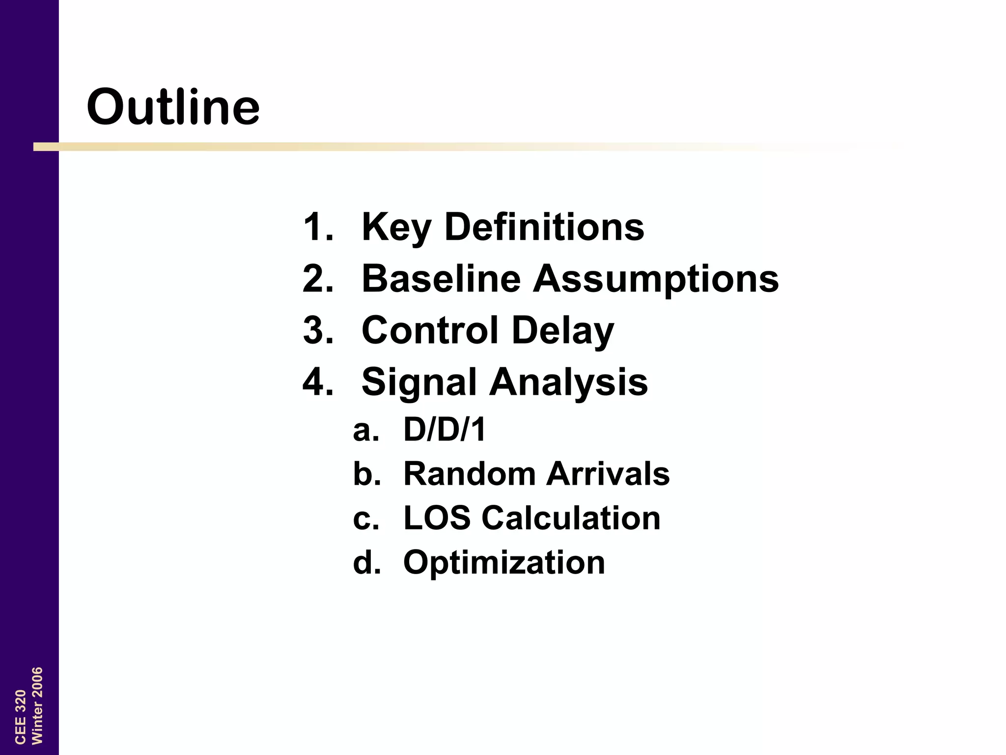 This document provides an overview of signalized intersection analysis and design for a transportation engineering course. It defines key terms related to signal timing, describes assumptions and methods for calculating traffic delay under uniform and random arrival conditions, and discusses optimizing signal timing for various performance measures. Sample calculations are provided to determine optimal cycle length and green time allocation using flow ratio-based methods. Level of service criteria are also defined based on average vehicle delay.