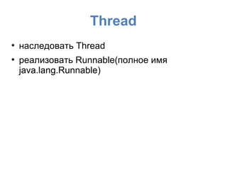 Документ представляет собой запись занятия по Java и Android, в частности, обсуждается работа с потоками и их жизненным циклом. Приводятся примеры реализации потоков, их остановки и использования классов Runnable и AsyncTask для выполнения фоновых задач. В конце документа указаны задания для самостоятельной работы и ссылки на литературу для дальнейшего изучения темы.