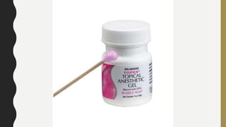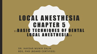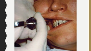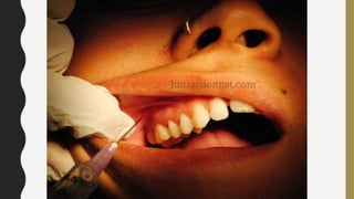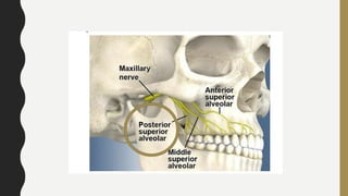 This document discusses techniques for local anesthesia in dentistry. It describes four main types of local anesthesia: topical, infiltration, field block, and regional block. Infiltration anesthesia involves depositing the anesthetic solution near terminal nerve fibers to infiltrate the tissue and anesthetize a localized area. It is commonly used for the front of the maxilla and mandible. Regional block anesthesia deposits the solution near the main nerve trunk to anesthetize a larger area. The document provides details on specific infiltration and regional block techniques for anesthetizing different areas of the maxilla and palate.