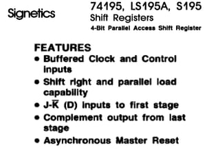 The document discusses various types of shift registers including the 74LS194 4-bit bidirectional universal shift register which can perform shift left, shift right, serial-serial, serial-parallel, parallel-serial, and parallel-parallel transfers. It also describes ring counters, Johnson counters, and linear feedback shift register (LFSR) counters. LFSR counters can cycle through all possible 2^n-1 states using feedback connections to determine the state sequence.