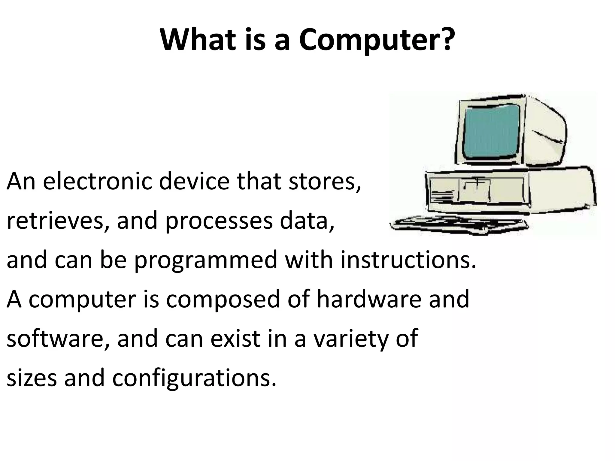 An electronic device that processes data and can be programmed with instructions is called a computer. It consists of both hardware and software. Hardware refers to the physical components like the system unit, keyboard, mouse, and monitor. Hardware components are divided into input devices like keyboards and mice, output devices like monitors and printers, storage devices like hard drives, and other components like the microprocessor.