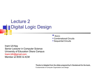It introduces basic concepts in digital logic like logic gates, truth tables, and complete gate sets. It then discusses combinational logic circuits like multiplexers, demultiplexers, decoders, comparators, and adders. Finally, it discusses sequential circuits and arithmetic logic units that can perform arithmetic and logical operations on binary numbers.