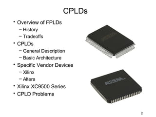 This document discusses complex programmable logic devices (CPLDs). CPLDs contain multiple simpler programmable logic devices (SPLDs) like PALs or GALs on a single chip connected by a programmable interconnect. This allows CPLDs to implement larger logic functions than SPLDs. CPLDs are made up of logic blocks, input/output blocks, and a programmable interconnect that can connect any logic block inputs or outputs. CPLDs generally provide better performance and more predictable timing than FPGAs but have lower density.