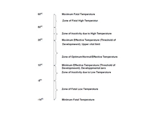 Temperature is the most important abiotic factor influencing insects. There are three main temperature zones for insects - the zone of effective temperature where development occurs (10-35°C), the zone of inactivity where insects live but do not develop (<10°C and >35°C), and the lethal zone where insects cannot survive (<-5°C and >50°C). Insects have adapted to different temperature ranges through mechanisms like cold hardiness, hybernation, and acclimatization. Temperature affects insect distribution, dispersal, development, metabolism, and fecundity. The total heat required for insect development is constant, known as the thermal constant.