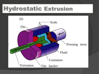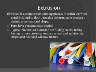 Extrusion is a process where a billet is forced to flow through a die opening under high pressure to produce a part with a constant cross-section. Common materials extruded include metals like aluminum, copper, steel, and plastics. The extrusion process begins by heating the billet and placing it into an extrusion press where a ram pushes it through a die. Direct extrusion uses a stationary die and moving ram, while indirect extrusion has a movable die within a hollow ram. Extrusion can produce complex shapes and is used to manufacture parts like tubing, profiles, and frames.