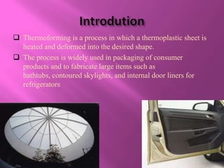 Thermoforming is a process where a heated plastic sheet is formed into a desired shape using pressure, vacuum, or mechanical methods. The key steps are heating the sheet, clamping it, and forming it using pressure or vacuum against a mold. Common applications include packaging, bathtubs, and large parts. Mass production uses thermoforming for thin packaging like blister packs while thicker sheets make larger parts like machine covers or boat hulls.