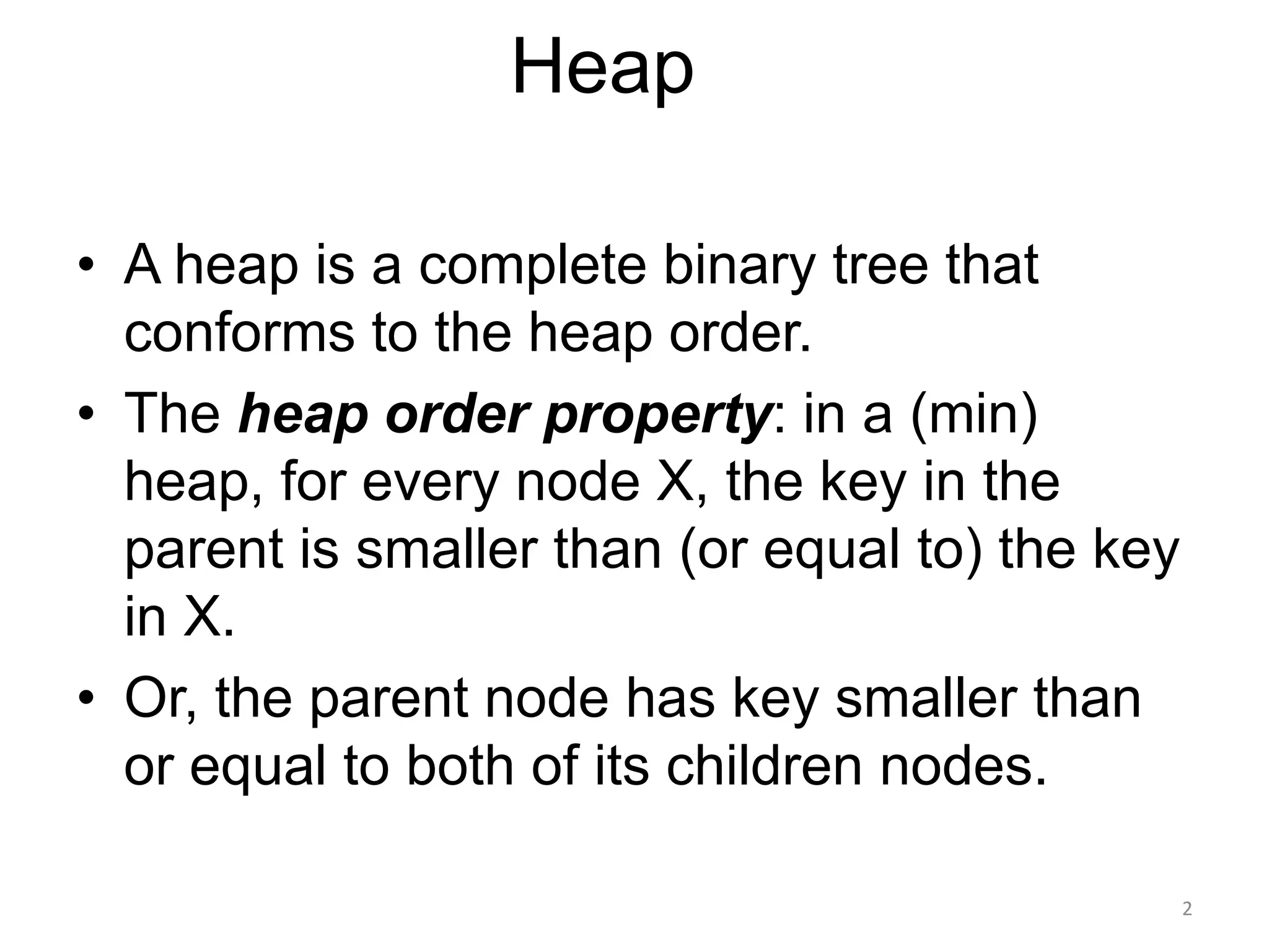 The document discusses binary heaps and algorithms for building, inserting, and deleting elements from heaps. It begins by defining min-heaps and max-heaps, and the heap property that parent nodes are smaller than child nodes in min-heaps and larger in max-heaps. It then covers algorithms for inserting new elements by placing them at the bottom and bubbling up, deleting the minimum/maximum element by replacing it with the last element and bubbling down. The document concludes by explaining that building a heap from a list of elements can be done in linear time by placing elements in an array and percolating them down level-by-level.
