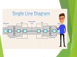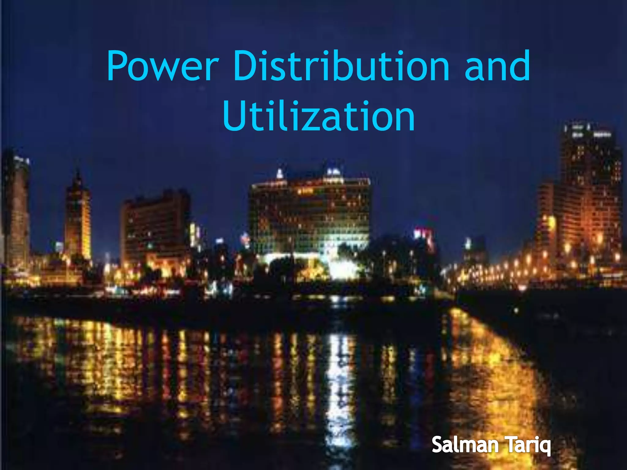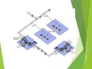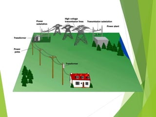 The document provides an overview of power distribution systems. It discusses how electricity is delivered from power plants to end users through a series of steps including increasing voltage at transmission substations, transporting energy along transmission lines, stepping down voltage at distribution substations, and carrying power along distribution lines to homes and businesses. It also describes the key components of distribution systems including overhead lines, underground cables, transformers, and different types of poles, insulators, and conductors used.