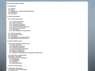 The document discusses the Software Requirements Specification (SRS), which precisely defines the software product to be built. The SRS includes user and system requirements, and fully describes what the software will do and how it will perform. It has a standard structure including an introduction, overall description of functions and constraints, and specific requirements for interfaces, performance, and design. An effective SRS is correct, unambiguous, complete, consistent, verifiable, modifiable, and traceable.