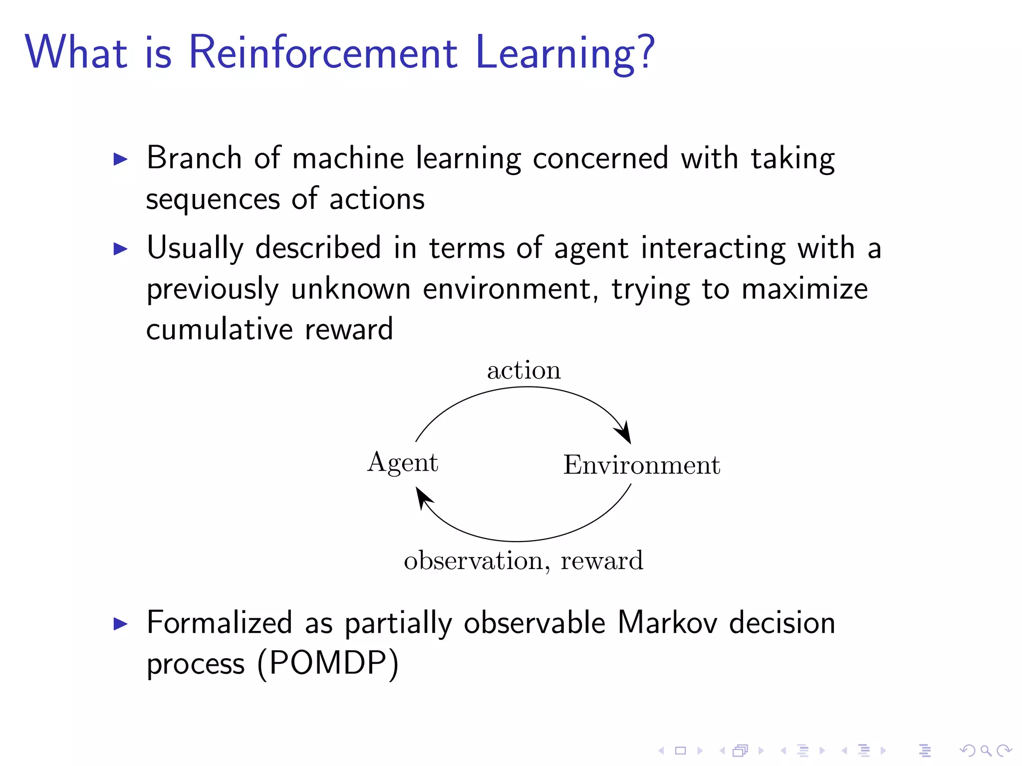 Reinforcement learning is a branch of machine learning concerned with agents taking actions in an environment to maximize rewards. It can be used for problems like robotics, inventory management, and machine translation. Deep reinforcement learning uses neural networks to approximate functions like policies, value functions, and dynamics models. Unlike supervised learning, reinforcement learning agents interact with a stateful environment and do not receive full examples, but must learn through interaction and trial and error. Recent successes include using deep RL for Atari games, robotics tasks, and Go with techniques like Q-learning, policy gradients, and Monte Carlo tree search.