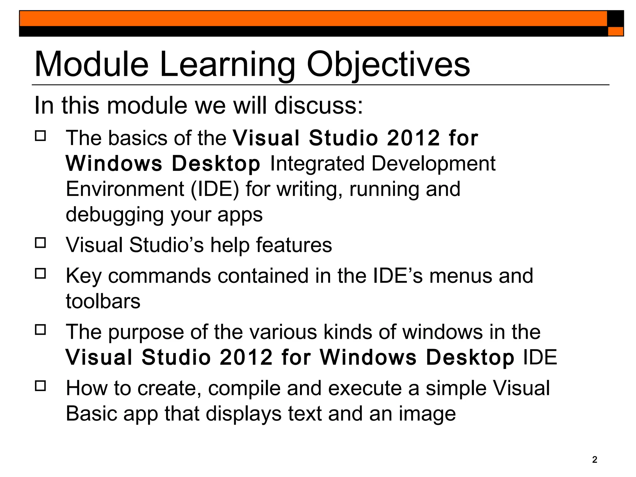 This document provides an introduction to Visual Studio 2012 for Windows desktop integrated development environment (IDE), focusing on creating, running, and debugging applications using Visual Basic. It covers the basics of the IDE, including managing projects, utilizing help features, and the components of the interface, such as the toolbox and properties window. The module includes instructions for developing a simple Visual Basic app through visual app development, emphasizing drag-and-drop functionality and property modification.