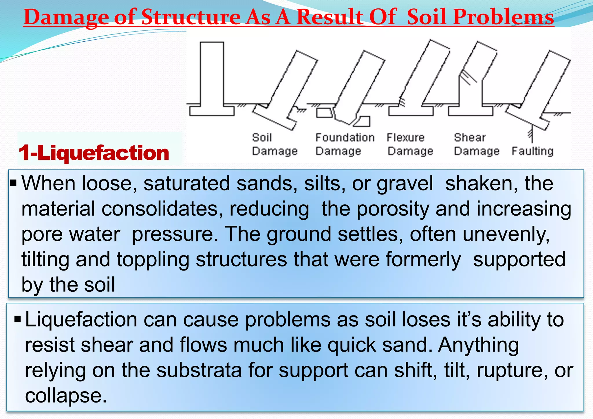 The document discusses the effects of liquefaction and landslides on structures during earthquakes, highlighting how soil conditions can lead to significant damage if a structure's foundation is not adequately designed. It outlines various structural failures, including foundation failures, soft stories, and torsional moments, stressing the importance of anchoring and design considerations during seismic events. The text also emphasizes the role of building characteristics, soil conditions, and analysis methods in determining a building's response to seismic forces.