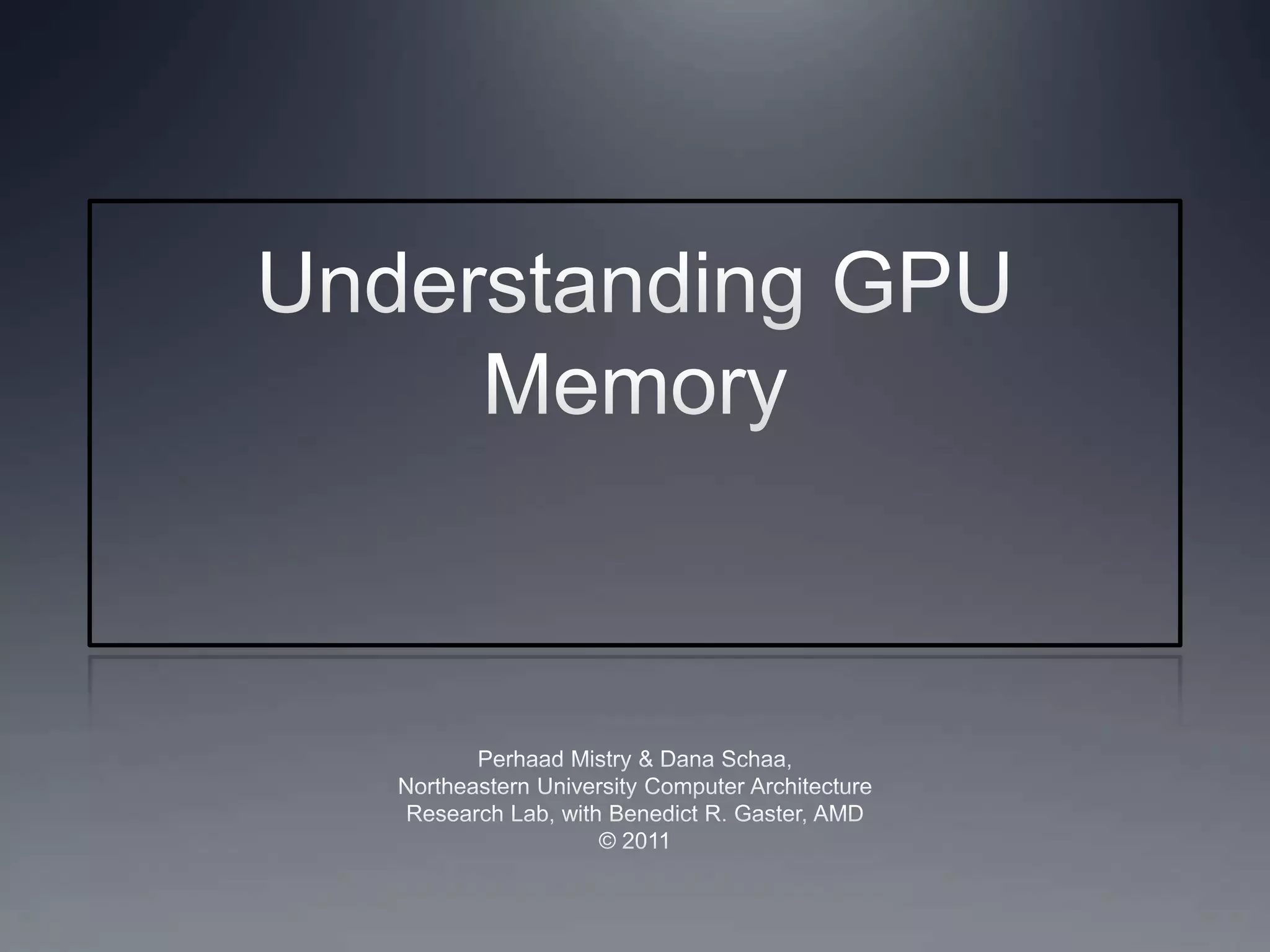 This document discusses GPU memory and how to optimize memory access patterns. It begins with an example of how a wide memory bus is used in GPUs. It describes the importance of coalescing memory accesses from multiple threads to fully utilize the bus bandwidth. It also discusses memory bank conflicts that can occur if multiple threads access the same memory bank, degrading performance. The key to high GPU memory bandwidth is coalescing accesses and avoiding bank conflicts.