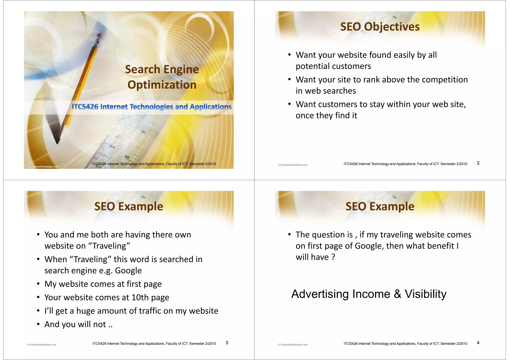 The document discusses search engine optimization (SEO) objectives and techniques. The three main SEO objectives are: 1) having a website easily found by potential customers through search engines, 2) ranking above competitors in search results, and 3) keeping visitors on the website once they arrive. The document then explains SEO techniques like researching keywords, optimizing pages for keywords, and measuring results to improve rankings over time. Overall, the goal of SEO is to drive more relevant traffic to a website through search engine results.