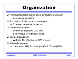This document provides an introduction to a course on CMOS VLSI design. It outlines the prerequisites, organization of the course, and relevance of VLSI design. It discusses the difference between architecture design and chip design. It provides an overview of the topics that will be covered in a bottom-up approach and using CAD tools. It also outlines the course goals, work involved including homework, projects and labs, exams and grading policy.