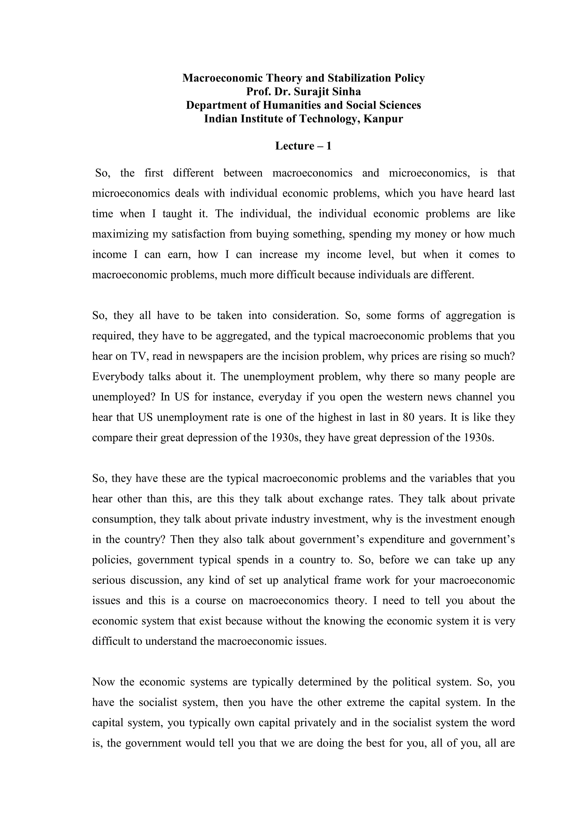 This document provides a summary of a lecture on macroeconomic theory and stabilization policy. The lecture begins by distinguishing between microeconomics, which deals with individual economic problems, and macroeconomics, which must aggregate individuals and consider more complex problems facing entire economies, such as inflation and unemployment.