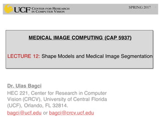 This document outlines a lecture on shape models and medical image segmentation, addressing the importance of shape in medical imaging and various shape modeling techniques such as active shape models (ASM) and oriented active shape models (OASM). It details the applications of shape analysis in fields like neuroscience, visual arts, and imaging, while also discussing the methodologies for model construction, landmark selection, and optimization in image segmentation. Additionally, comparisons between ASM and OASM highlight improvements in segmentation accuracy and efficiency.