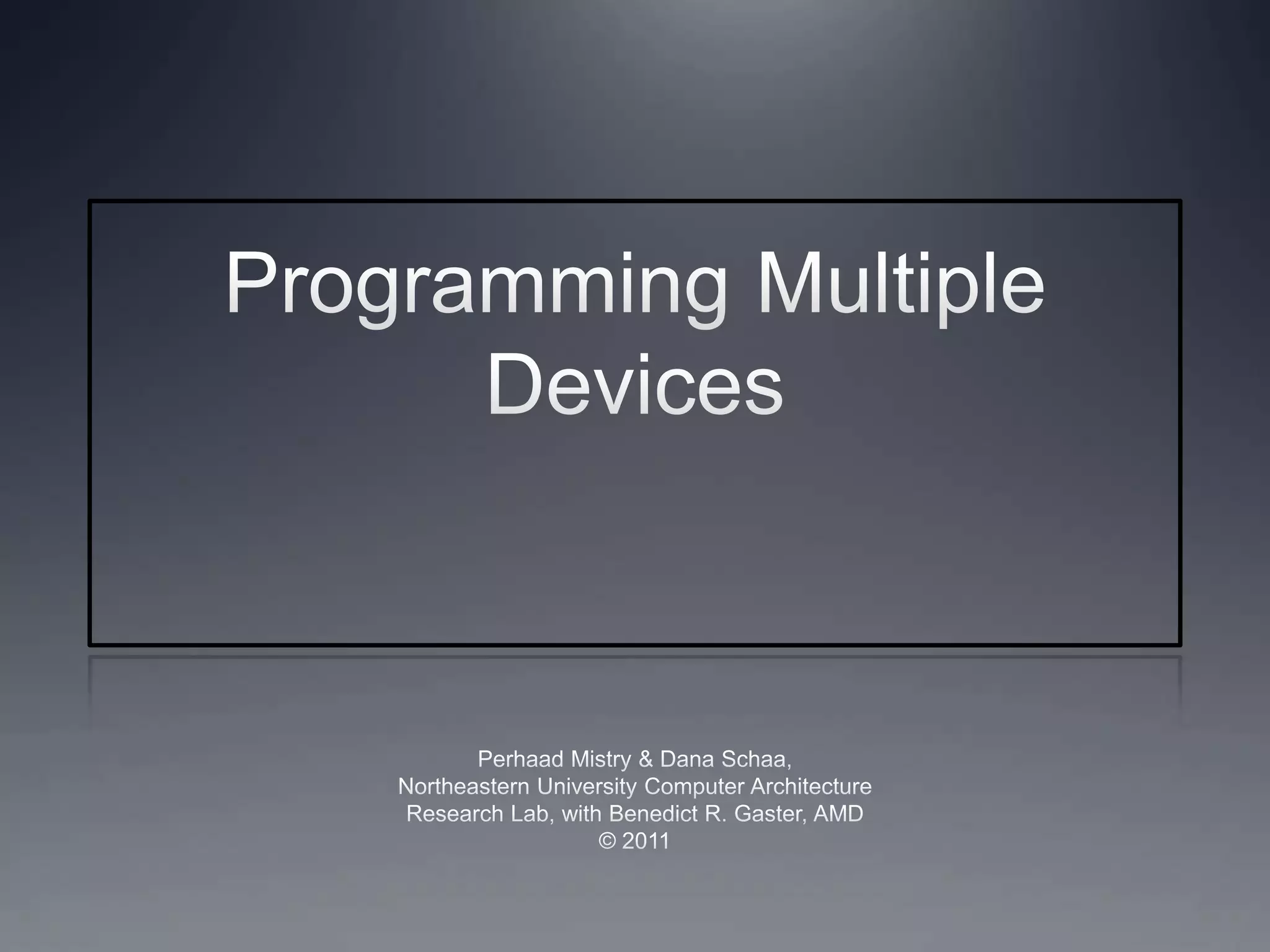 This document discusses approaches to programming multiple devices in OpenCL, including using a single context with multiple devices or multiple contexts. With a single context, memory objects are shared but data must be explicitly transferred between devices. Multiple contexts allow splitting work by device but require extra communication. Load balancing work between heterogeneous CPUs and GPUs requires considering scheduling overhead and data location.