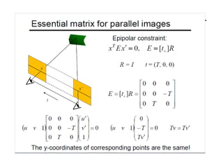 The document discusses binocular stereo vision and methods for estimating depth from stereo image pairs. It describes how humans can perceive depth from stereo vision and basic stereo matching algorithms that find correspondences between left and right images to compute a dense depth map. It also discusses challenges like the correspondence problem and limitations of window-based matching. More advanced methods formulate stereo matching as an energy minimization problem that can be solved using techniques like graph cuts.