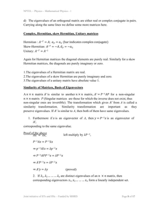 This document discusses linear transformations and matrices. It introduces how linear transformations on physical quantities are usually described by matrices, where a column vector u representing a physical quantity is transformed into another column vector Au by a transformation matrix A. As an example, it discusses orthogonal transformations, where the transformation matrix A is orthogonal. It proves that for an orthogonal transformation, the inner product of two vectors remains invariant. It also discusses properties of other types of matrices like Hermitian, skew-Hermitian and unitary matrices.