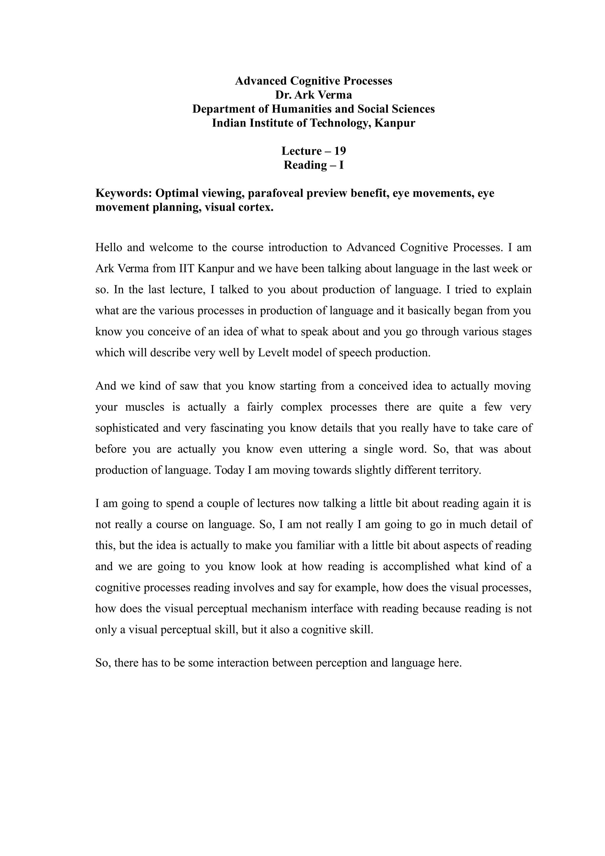 - The document discusses reading as a cognitive process that involves coordination between motor, visual, and cognitive processes. It involves moving the eyes across text in a systematic way through fixations and saccades.