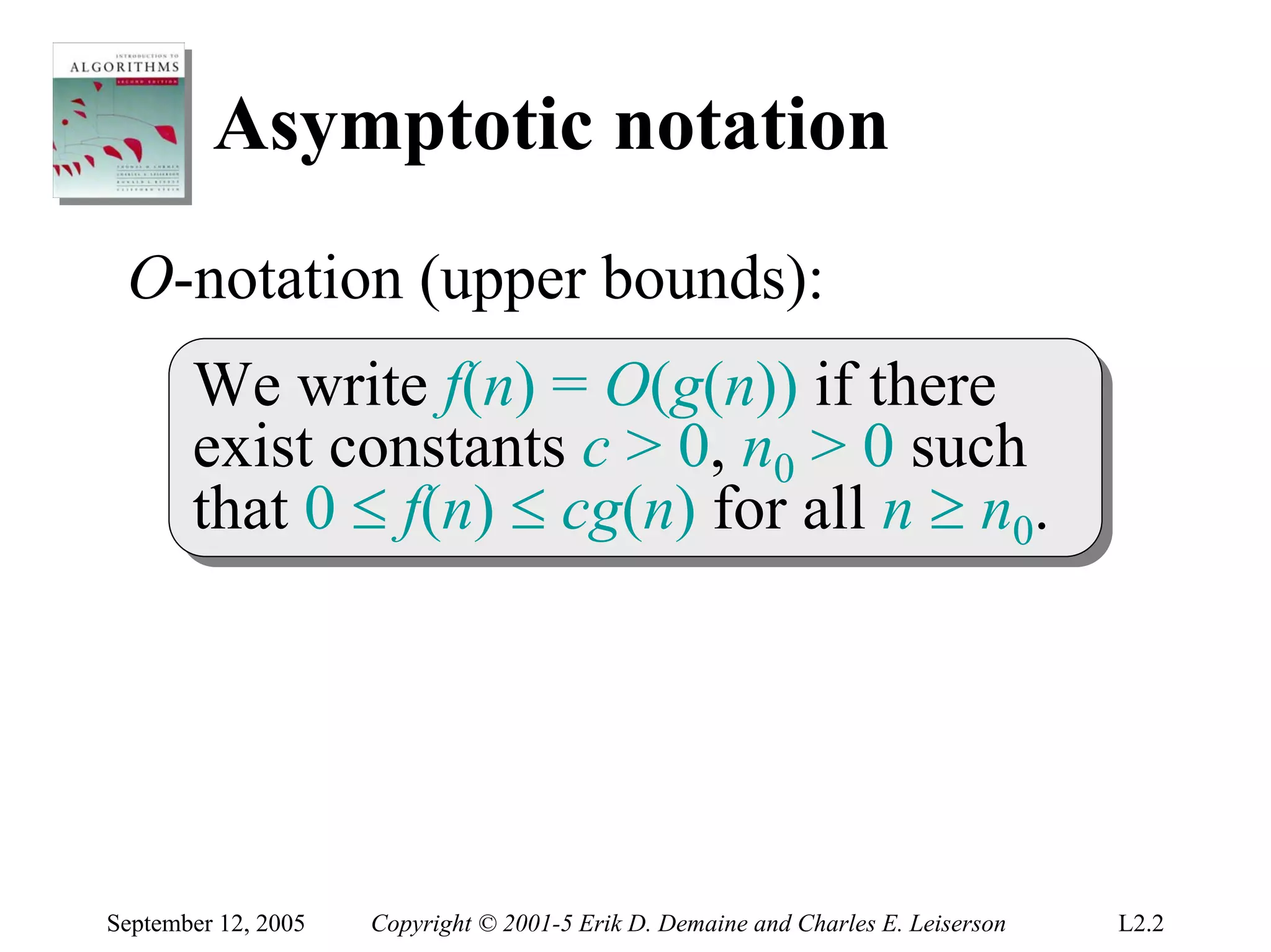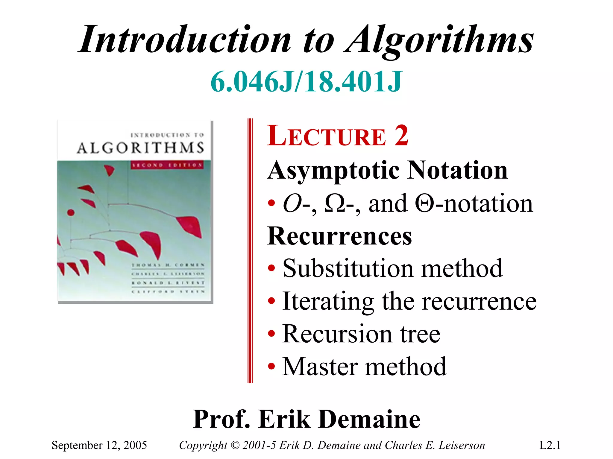 This document summarizes a lecture on asymptotic notation and techniques for solving recurrence relations. It introduces O, Ω, and Θ notation for describing asymptotic upper bounds, lower bounds, and tight bounds of functions. It also discusses methods for solving recurrence relations, including the substitution method of guessing a solution, verifying it by induction, and solving for constants. Recurrence relations are important for analyzing divide-and-conquer algorithms.