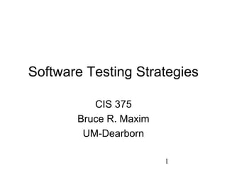 This document discusses strategies for software testing at different stages of development. It begins by outlining a strategic approach starting with component testing and working outward to integration testing. Different techniques are appropriate at different stages. The stages discussed include unit testing, integration testing, function testing, performance testing, acceptance testing, and installation testing. Details are provided on techniques for each stage like top-down vs bottom-up integration testing. The roles of testers, tools, and documentation are also summarized.