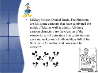 Animation involves creating the illusion of movement by displaying a sequence of slightly different images in rapid succession. It can be created through traditional techniques like cel animation using hand-drawn images or computer animation using 3D modeling software. Common types include key frame animation where frames in between key poses are automated, stop motion using physical objects manipulated frame-by-frame, and morphing where one image transforms smoothly into another. Rendering and file compression are important parts of the animation process.