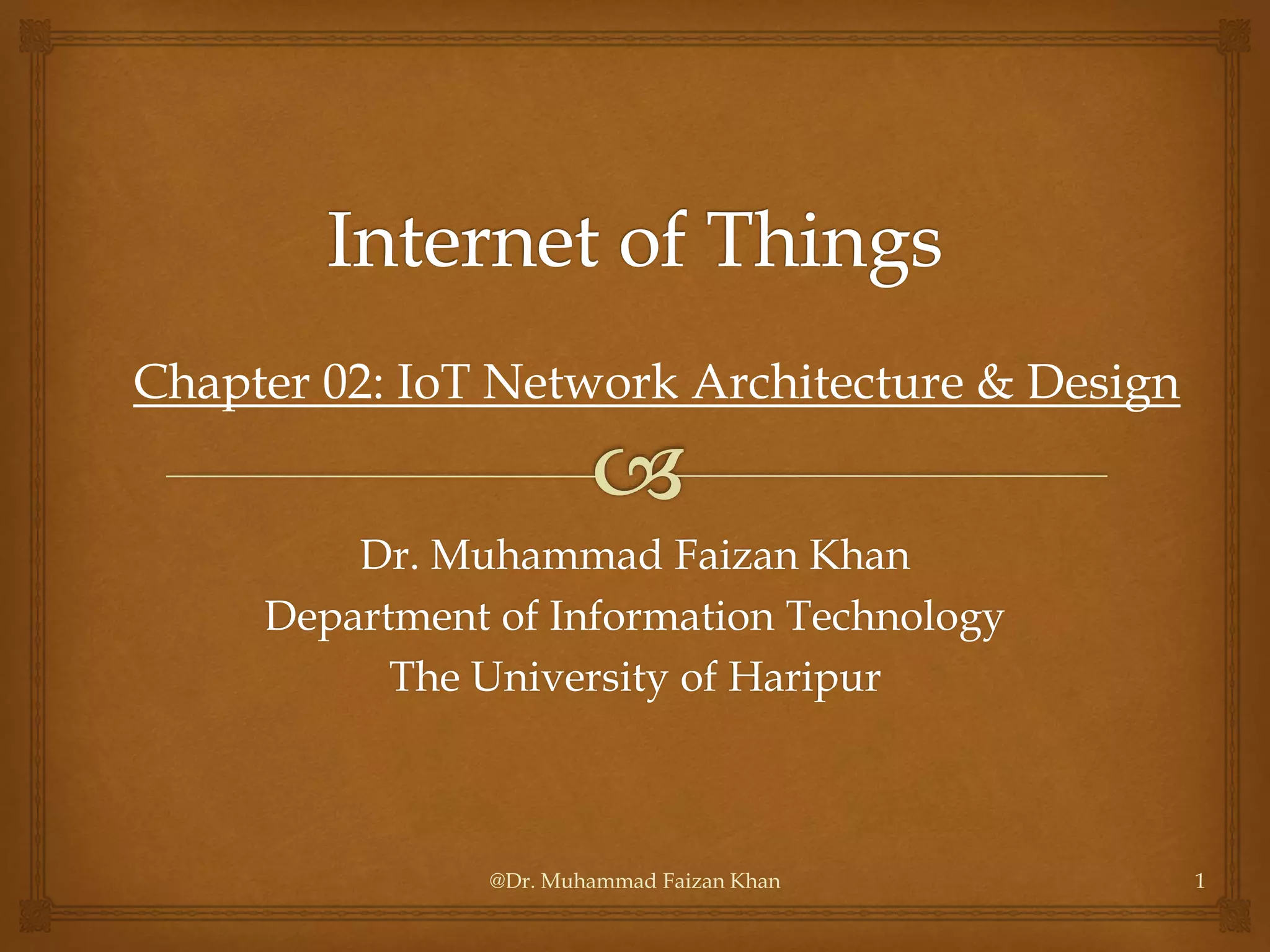 The document discusses two common IoT network architectures: oneM2M and the IoT World Forum (IoTWF) architecture. The oneM2M architecture divides functions into an application layer, services layer, and network layer. The IoTWF architecture is a seven-layer model with layers including physical devices, connectivity, edge computing, data storage and analytics, and applications. Both architectures aim to provide standardized frameworks to address challenges of designing large-scale IoT networks.