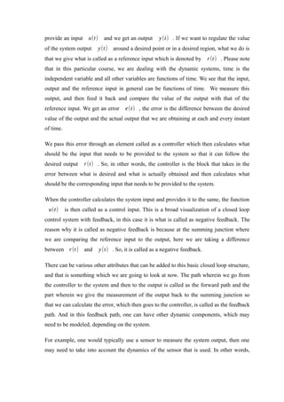 - The document provides an overview of feedback control systems and key concepts related to their design and analysis.