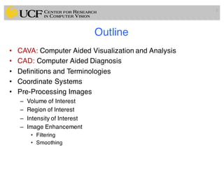 The lecture covers the fundamentals of medical image computing, focusing on pre-processing medical images, including definitions, terminologies, and techniques such as volume of interest, region of interest, and various filtering methods. It discusses the importance of computer-aided visualization and diagnosis in enhancing the quality of medical images for improved analysis and decision-making. Various noise suppression and enhancement techniques, such as Gaussian and median filtering, are also explored to enhance image quality for better diagnostic outcomes.
