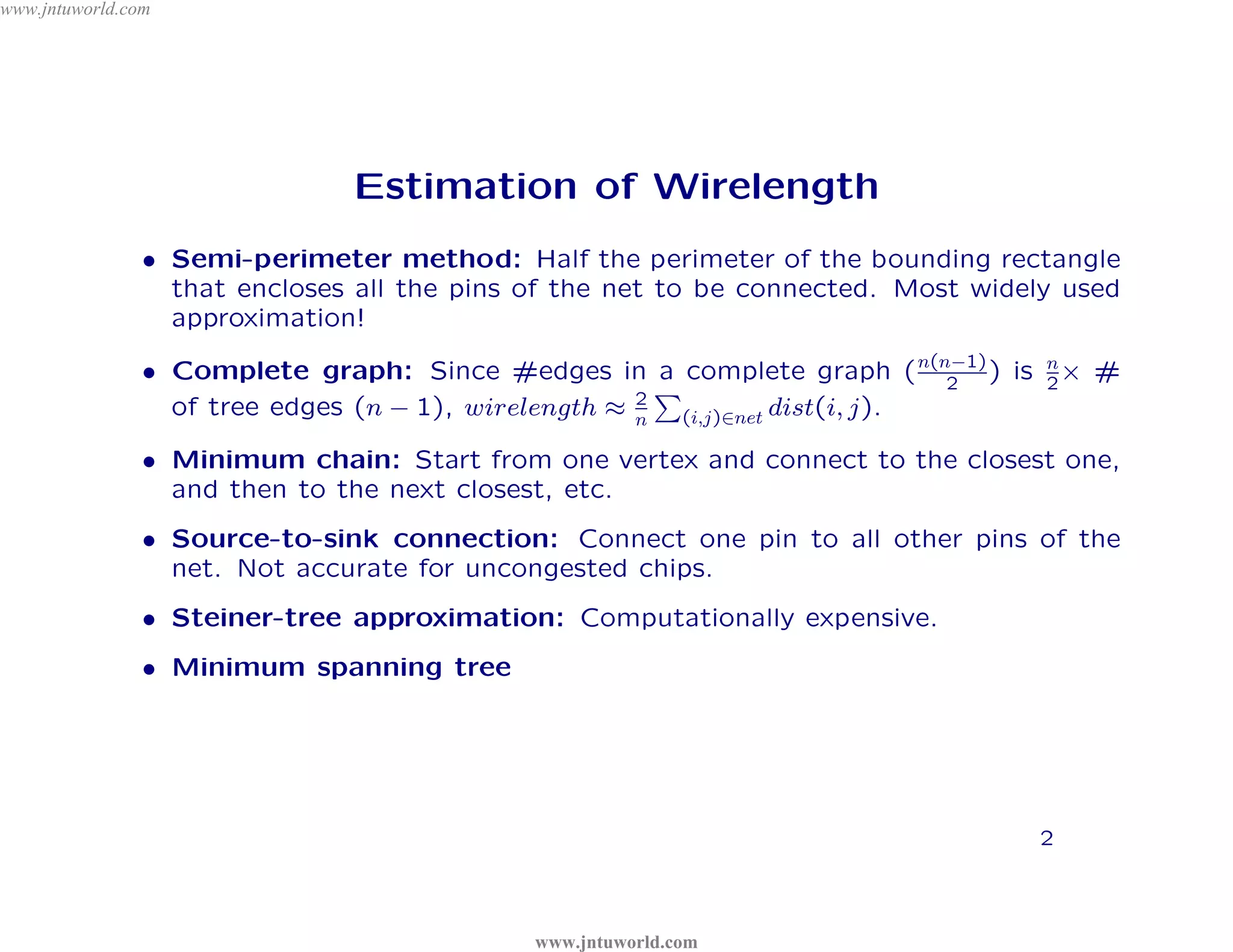 The document discusses placement algorithms used in circuit design. It describes the min-cut placement algorithm which partitions the layout surface and circuit into halves recursively to minimize wirelength. Terminal propagation is discussed to address limitations of min-cut by considering terminal pin positions. Placement by simulated annealing is also summarized, using neighborhood structures and cost functions to iteratively improve placement quality as temperature decreases.